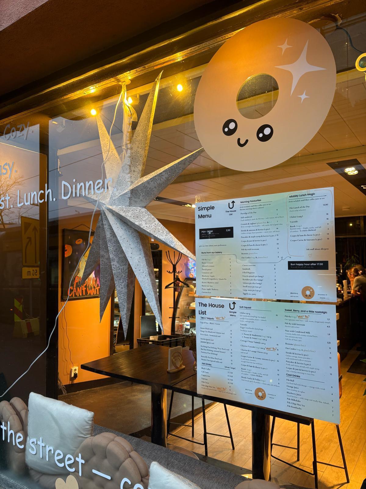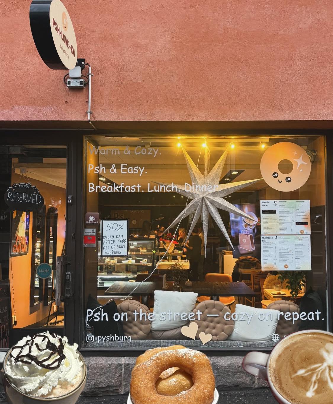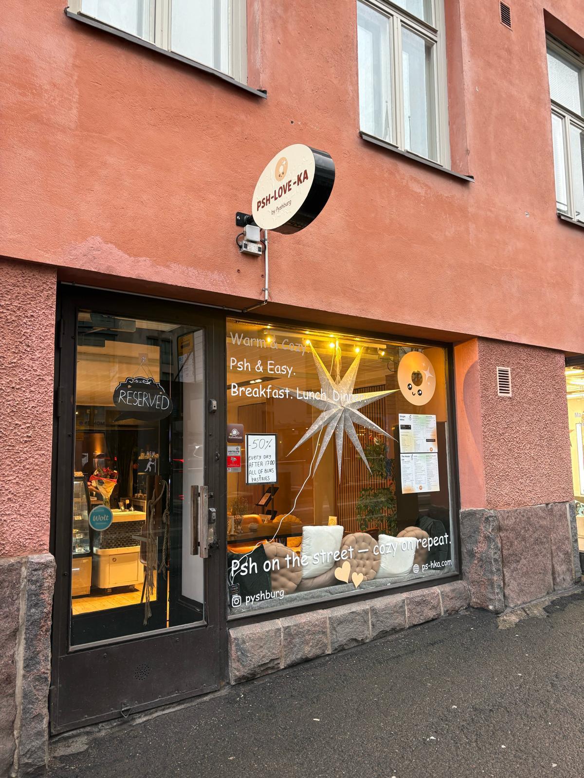PSH-KA is a small café with a big heart. We honor tradition through flavor—from the golden crisp of our Psh-ka to the aromatic warmth of Glögi. Step inside and find your cozy corner in Helsinki.
